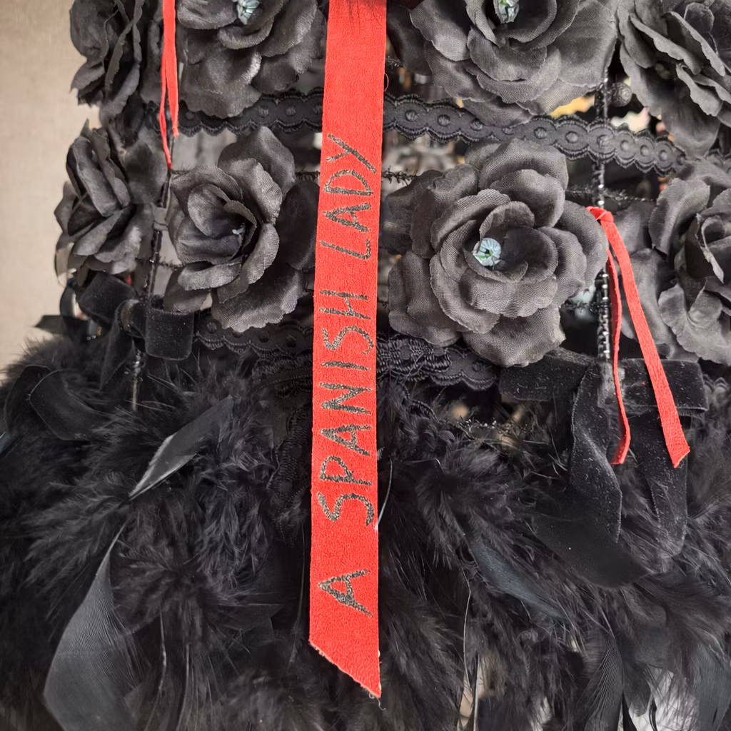 "A Spanish Lady" är en hängande lampa där skärmen är täckt av svarta rosor, rosetter och fjädrar. Uttrycket bygger på kombinationen av dessa material och former.