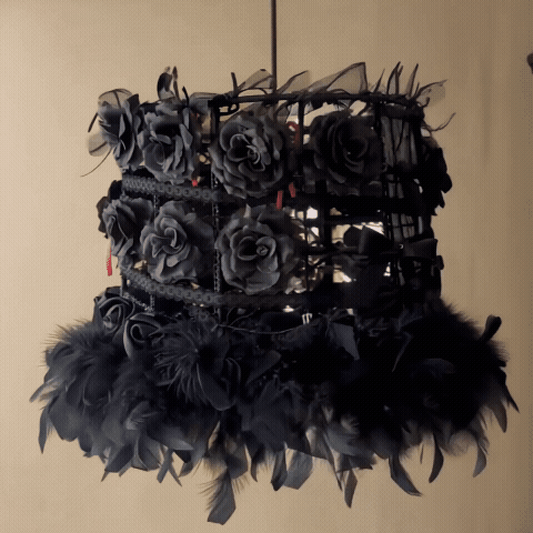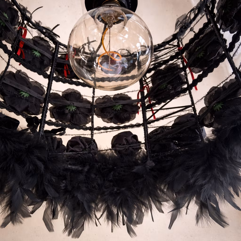 En hängande lampa med skärm täckt av svarta rosor, rosetter och fjädrar, kompletterad med stor glödlampa och extra lång tygklädd sladd.