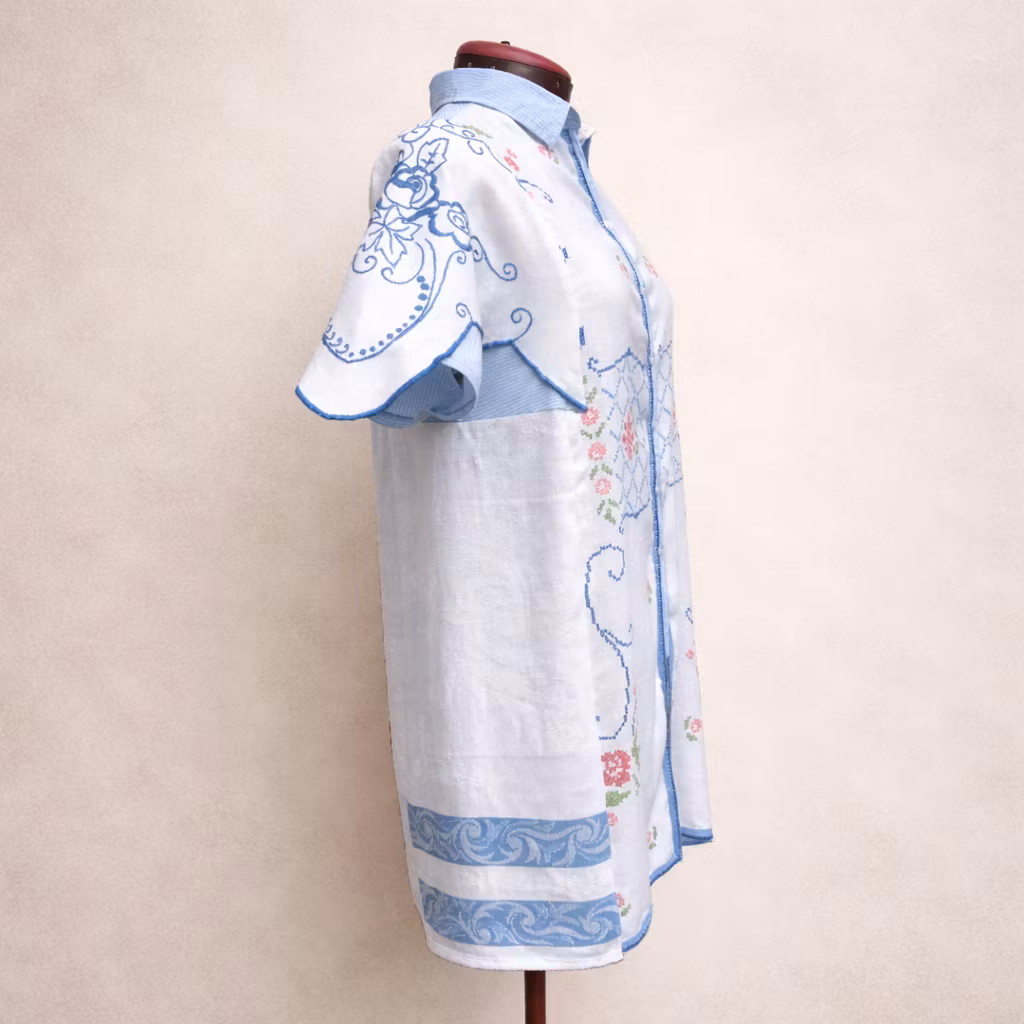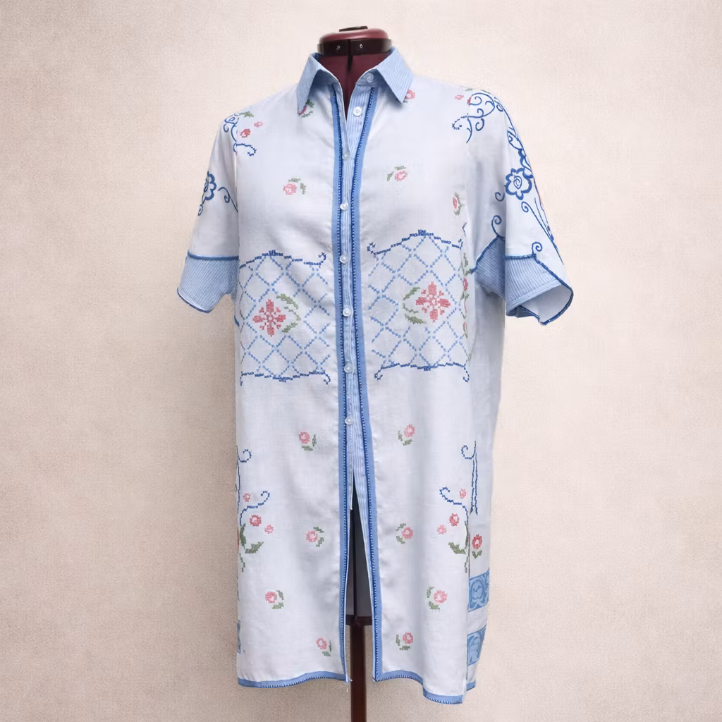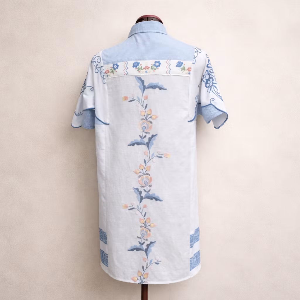En blusklänning i stl ca 38 med kort ärm och knäkort längd. Sydd av diverse broderade dukar samt knappslå och krage från en blus i tunn bomull. Allt i blått och vitt.