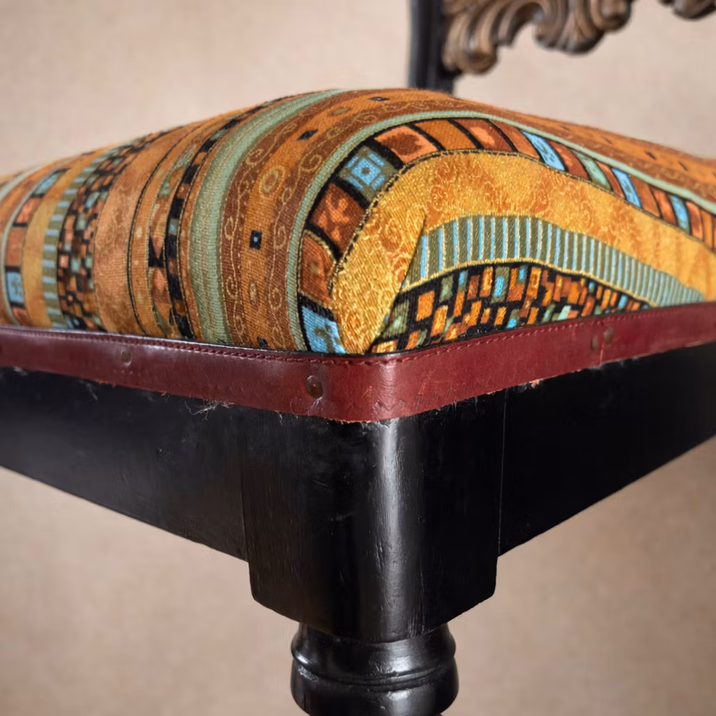 Denna stol har renoverats genom omlackering i svart och kompletterats med guldfärgade detaljer. Sitsen har klätts om och ger stolen ett uppdaterat uttryck.